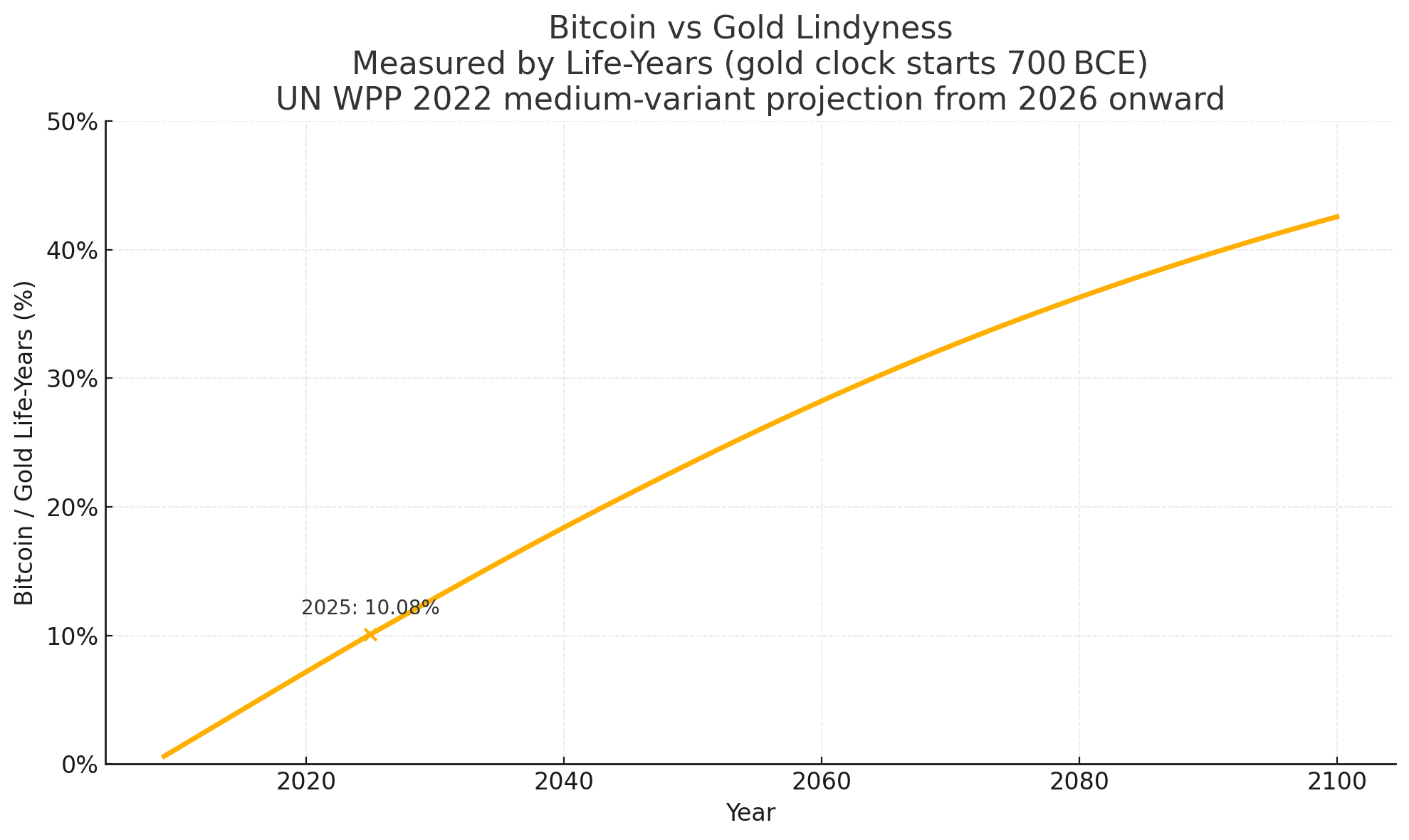 On a simple calendar scale bitcoin has existed for just 0.6% of gold’s lifespan, yet when we weight the years by the number of minds alive to evaluate each asset, bitcoin’s attention-time lifespan rises to about ten percent of gold’s lifespan. Because today’s world hosts far more observers than any earlier period, recent years carry greater informational weight, and in aggregate humanity has “experienced” bitcoin one tenth as much as it has experienced gold.