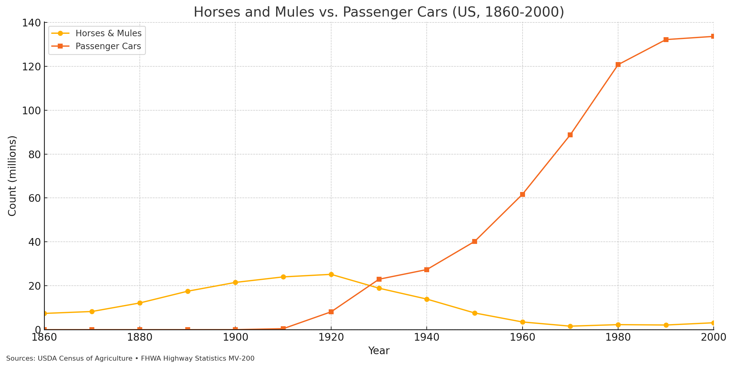 In the 1800s horses supplied roughly half of all mechanical labor in the US1. Horses let farmers work ten times more farmland, hauled transit cars, freight, and mail. In the 1880s, a quarter of US cropland grew oats and hay to feed the nation’s biological engines. By 1920 there were 27 million horses in the US and more than 1.3 million pounds of manure that needed to be shoveled off of the streets of New York City every single day.