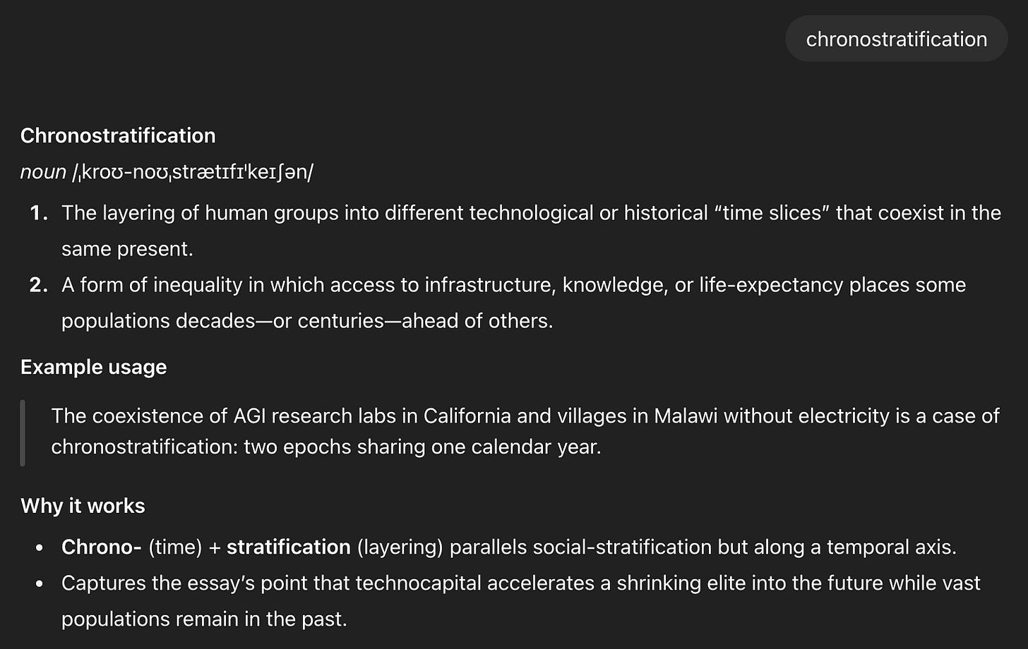 If we can leave an entire nation that far behind without outrage, we have tacitly endorsed the notion of surplus humanity. Perhaps the future Land and Yarvin describe isn’t approaching, it’s already here. Time accelerates forward for a shrinking technocapital elite, while for everyone else it staggers. We may soon share a chronostratified planet where some live hundreds of years ahead of those still stuck in the 1900s.