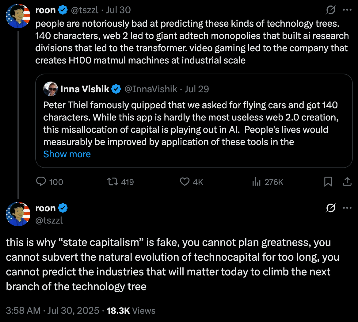 And so I am left here, pacing around my room, thinking about what will happen to civilization as we know it. As a humble market participant I have learned to respect the sometimes unintelligible magnificence of the complex systems that have emerged. The people that used to complain humanity’s top talent was being wasted on adtech and financial markets have fallen silent now as we race toward AGI. For the human observer, the complexity of the system and the progression of the tech tree has become too intricate to fully understand, much less to steer.