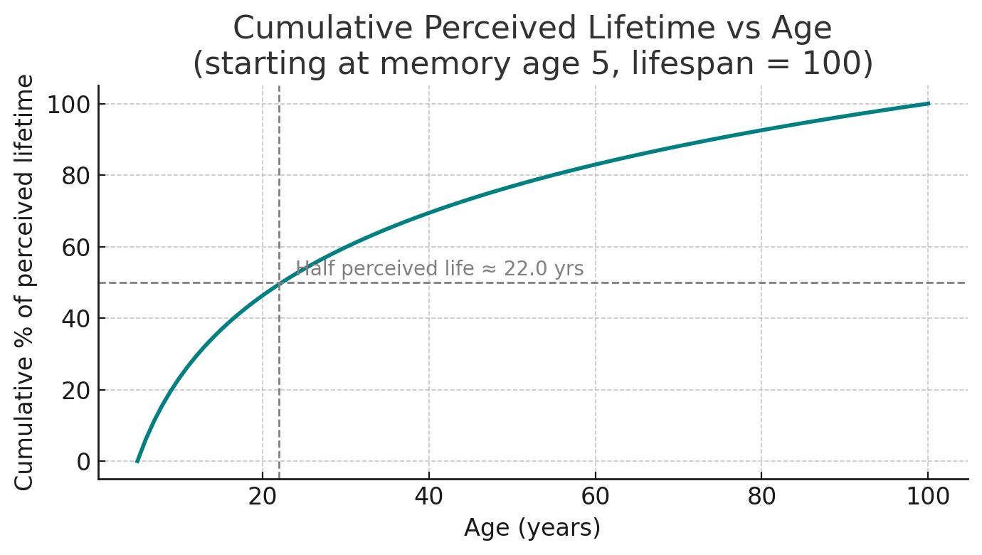 Most of my friends say the opposite that these same three years flashed by. French philosopher Paul Janet’s old ratio-of-life idea explains the gap: at ten, a year is a tenth of your entire memory bank, but by fifty it’s only two percent. By twenty-two you’ve already “spent” half your subjective lifetime, so unless you cram it with fresh events, each new calendar year keeps shrinking.