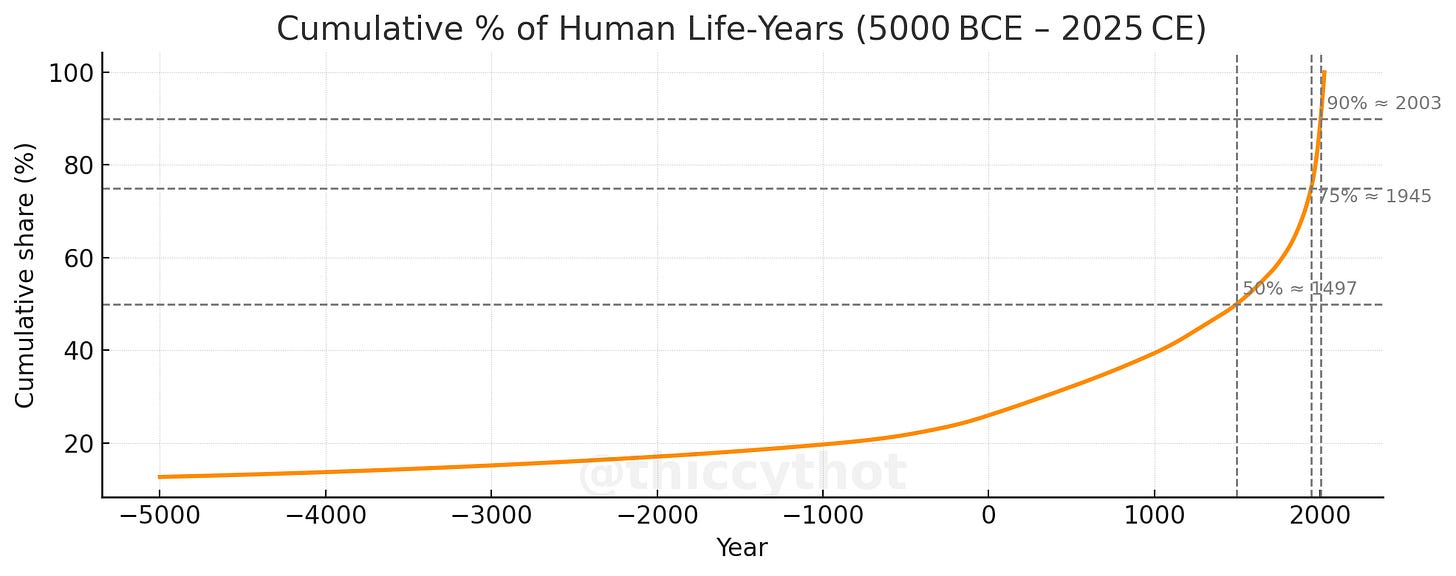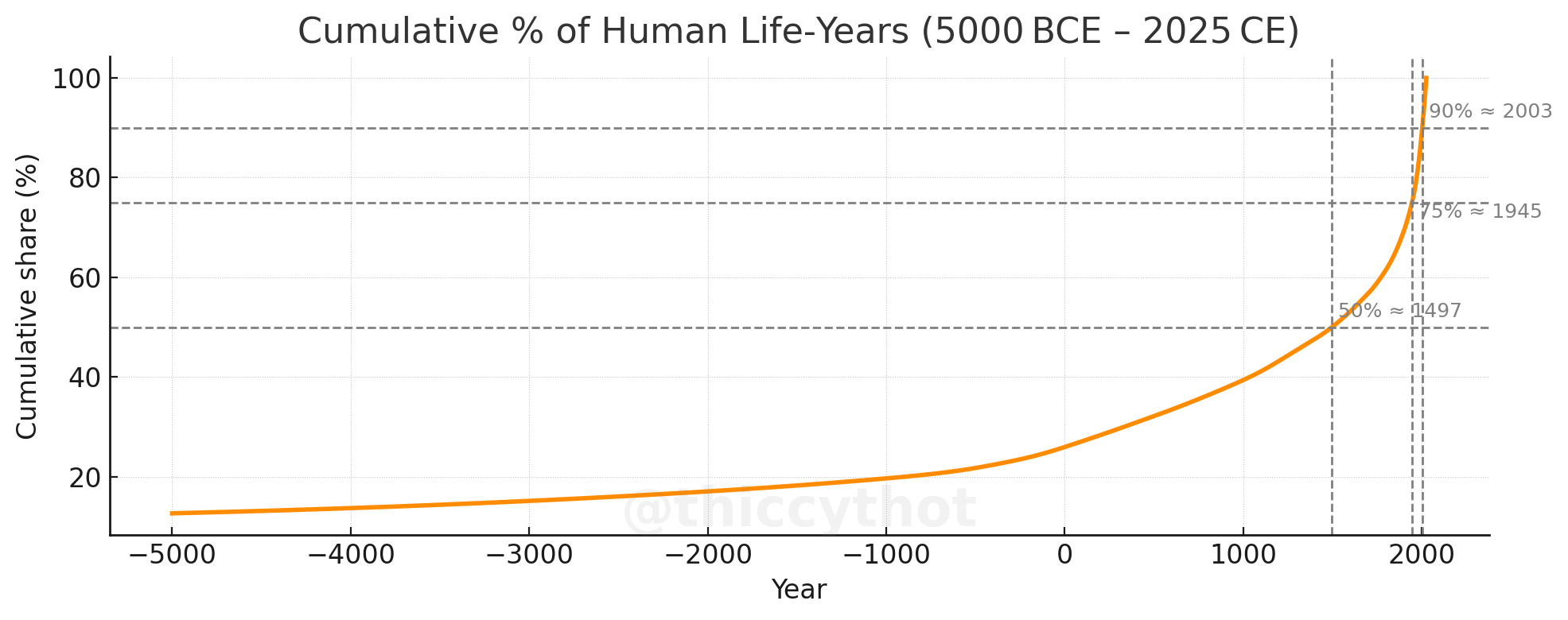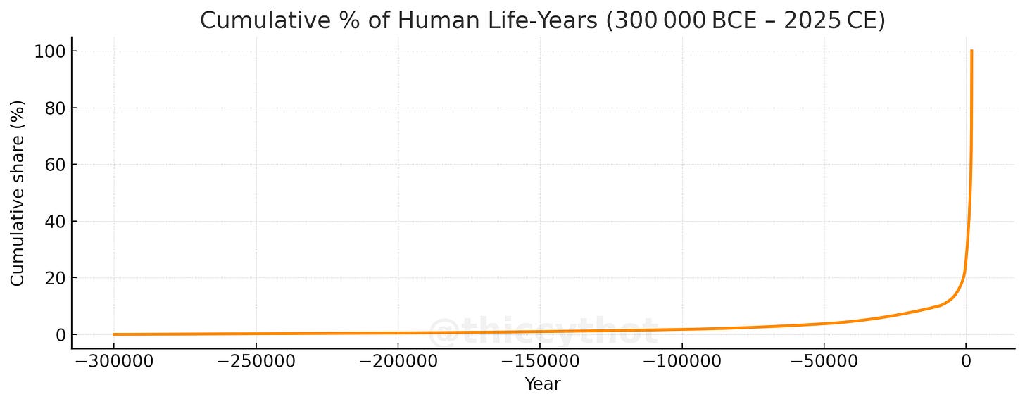 I charted the cumulative total of human life years by anchoring on known population figures from public datasets and linearly interpolated the gaps without introducing any assumptions about average lifespan (code below if you want to tweak the anchors).2